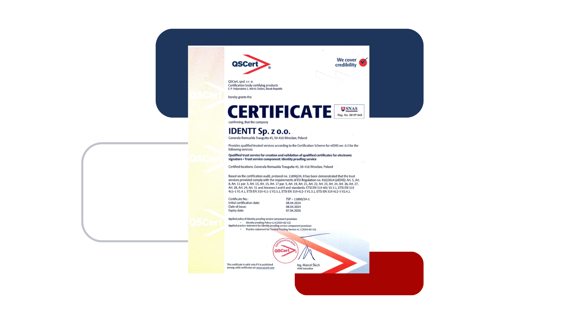 Nasze rozwiązania spełniają najwyższe standardy bezpieczeństwa i jakości – potwierdzone certyfikatem QSCert dla Identity Proofing Service, zgodnym z rozporządzeniem eIDAS.