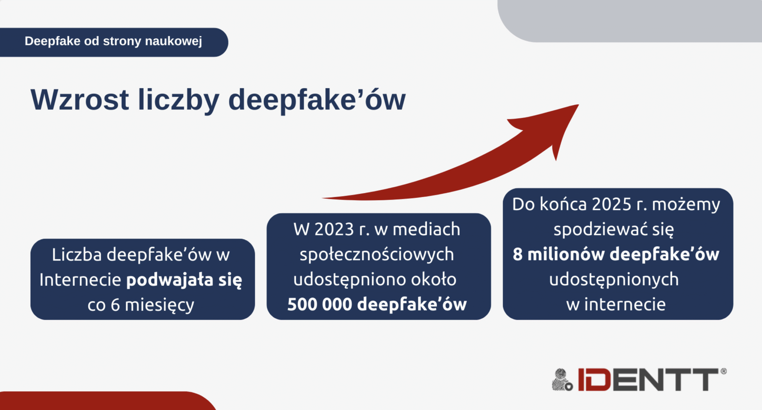 Na przykład w 2024 roku firma z Singapuru padła ofiarą deepfake podszywającego się pod jej CEO – pracownik przelał 25 mln USD, wierząc, że polecenie było prawdziwe, a dopiero później odkryto, że nagranie było syntetyczne. Pokazuje to, jak deepfake’i mogą omijać tradycyjne mechanizmy weryfikacji i prowadzić do ogromnych strat finansowych. Podobnie raport Veriff z 2025 roku wykazał, że obecnie 1 na 20 nieudanych procesów weryfikacji tożsamości wynika z manipulacji deepfake, co dowodzi, że zjawisko to stało się problemem powszechnym.