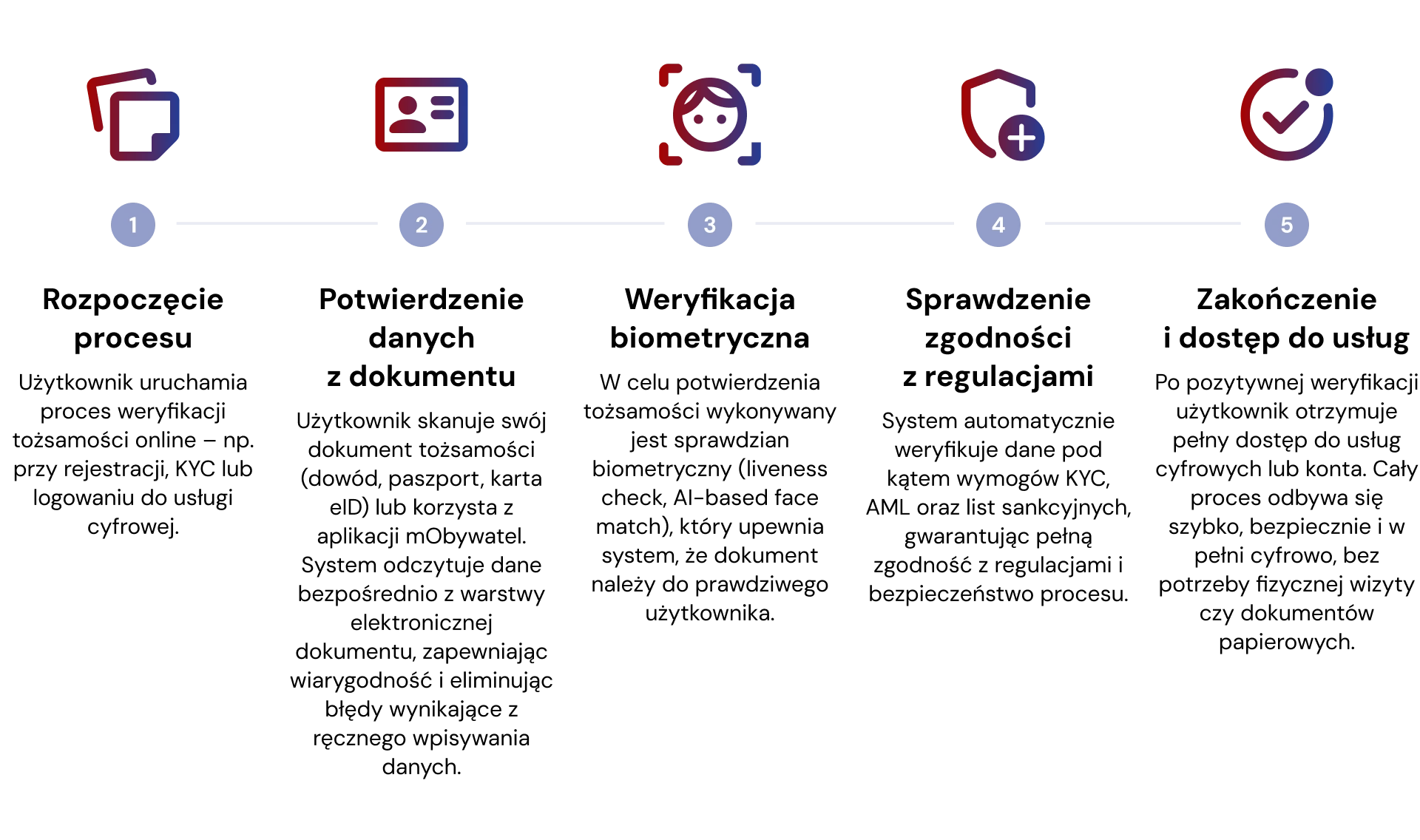 Bezpieczna i precyzyjna weryfikacja tożsamości wykorzystująca nowoczesne technologie cyfrowe wspierająca procesy weryfikacji KYC i onboarding użytkowników w środowisku cyfrowym.